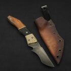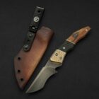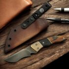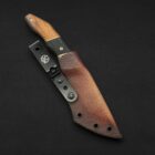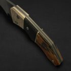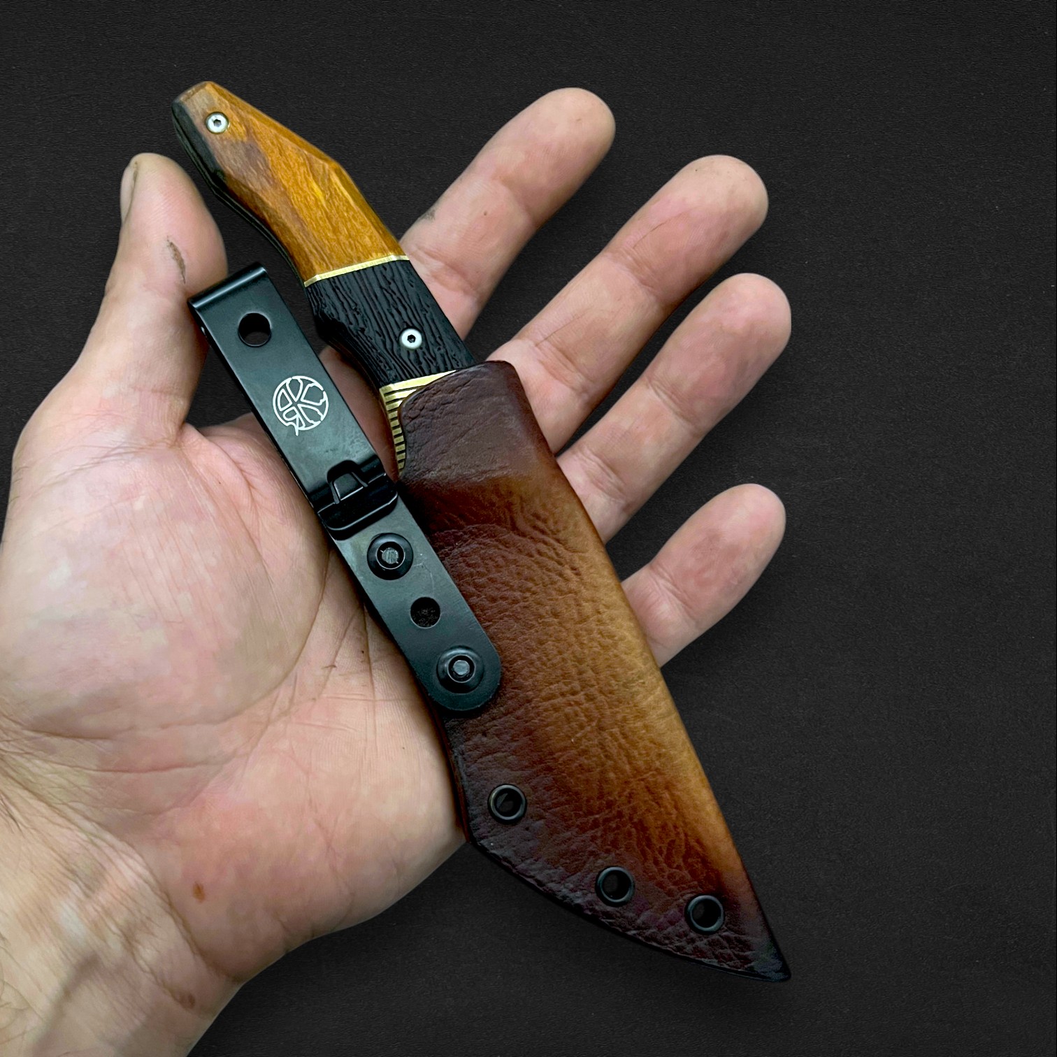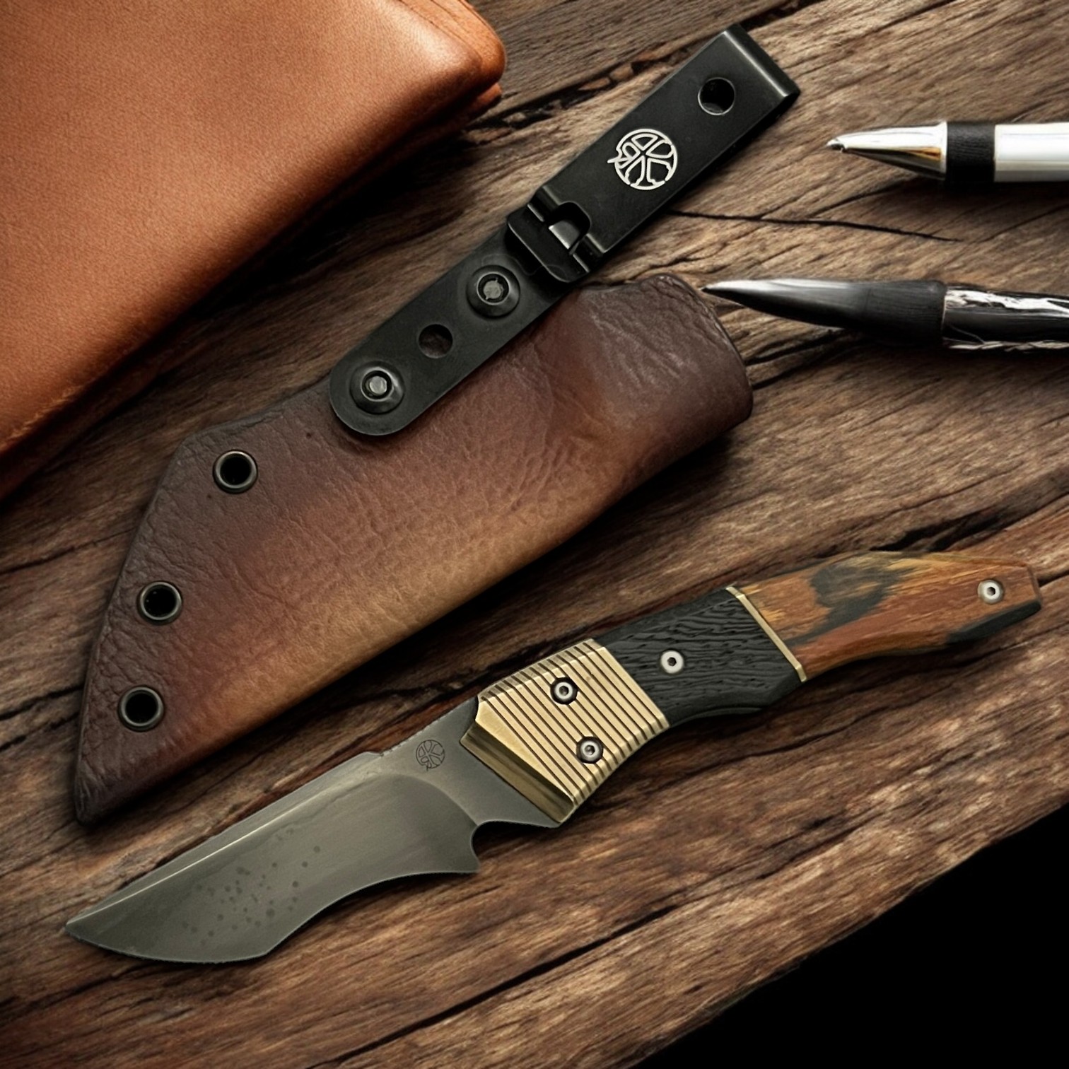 An elegant full-tang build with an antique soul. The 80CRV2 carbon-steel blade carries a smoky, hand-finished patina, while the handle layers spalted maple with ancient bog oak for a warm, timeworn character. Brass bolsters, liners, and spacer tie the whole package together, giving this compact EDC a rich, old-world glow. A hybrid Kydex/leather sheath with pocket clip keeps it secure for everyday carry.