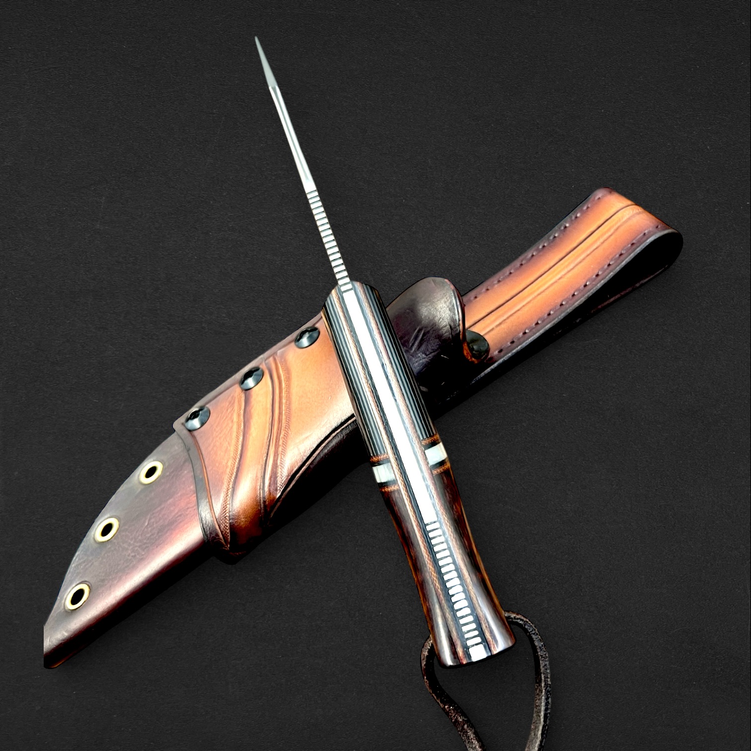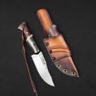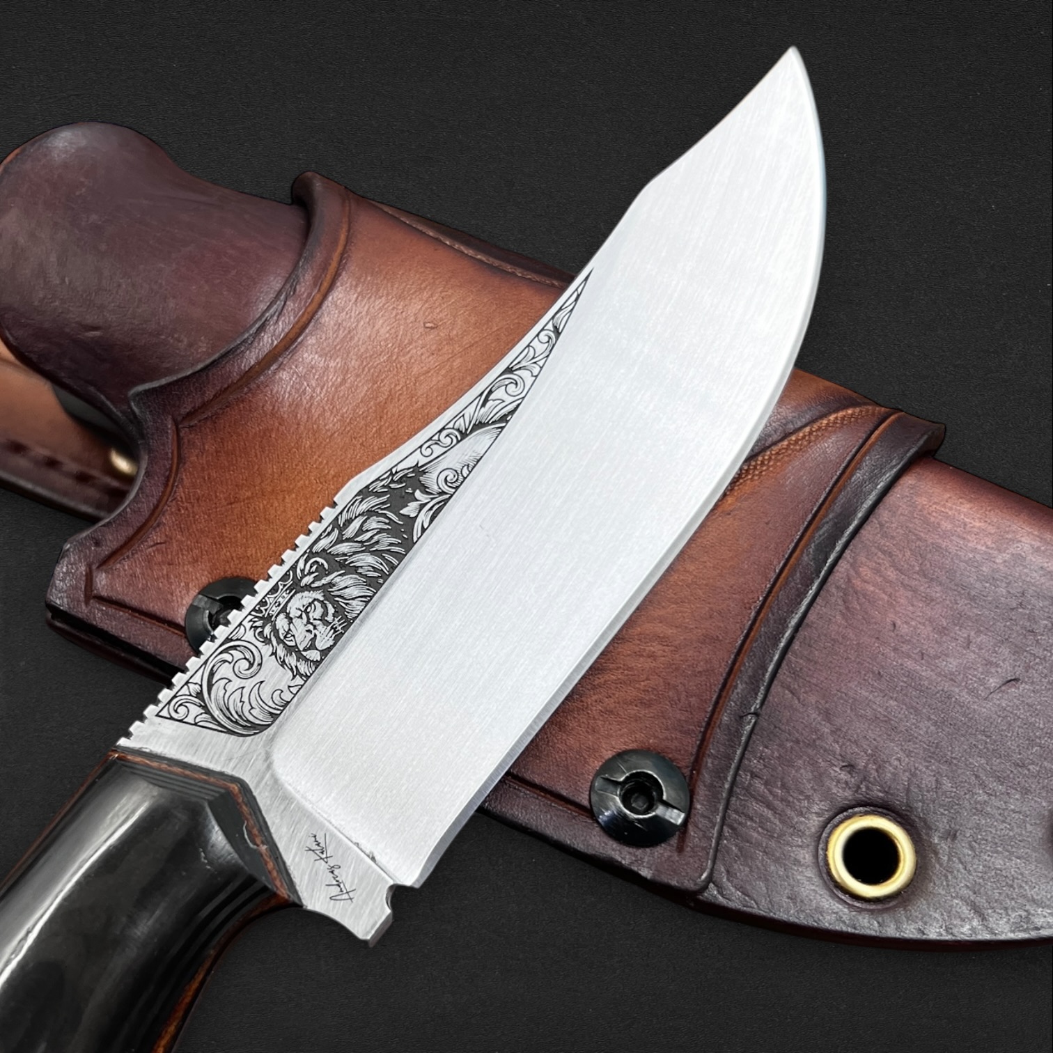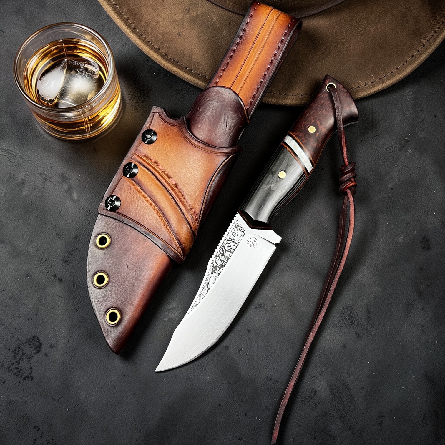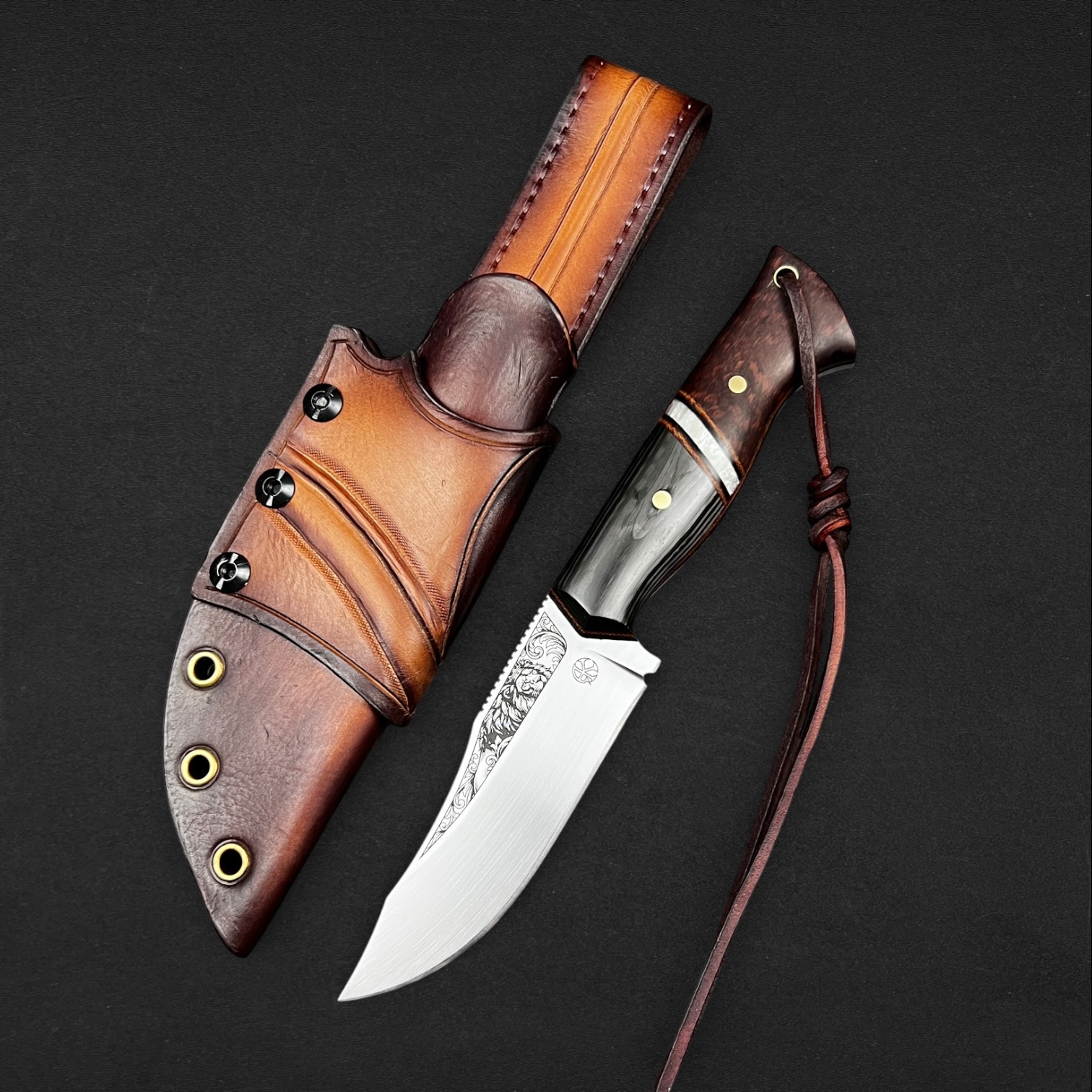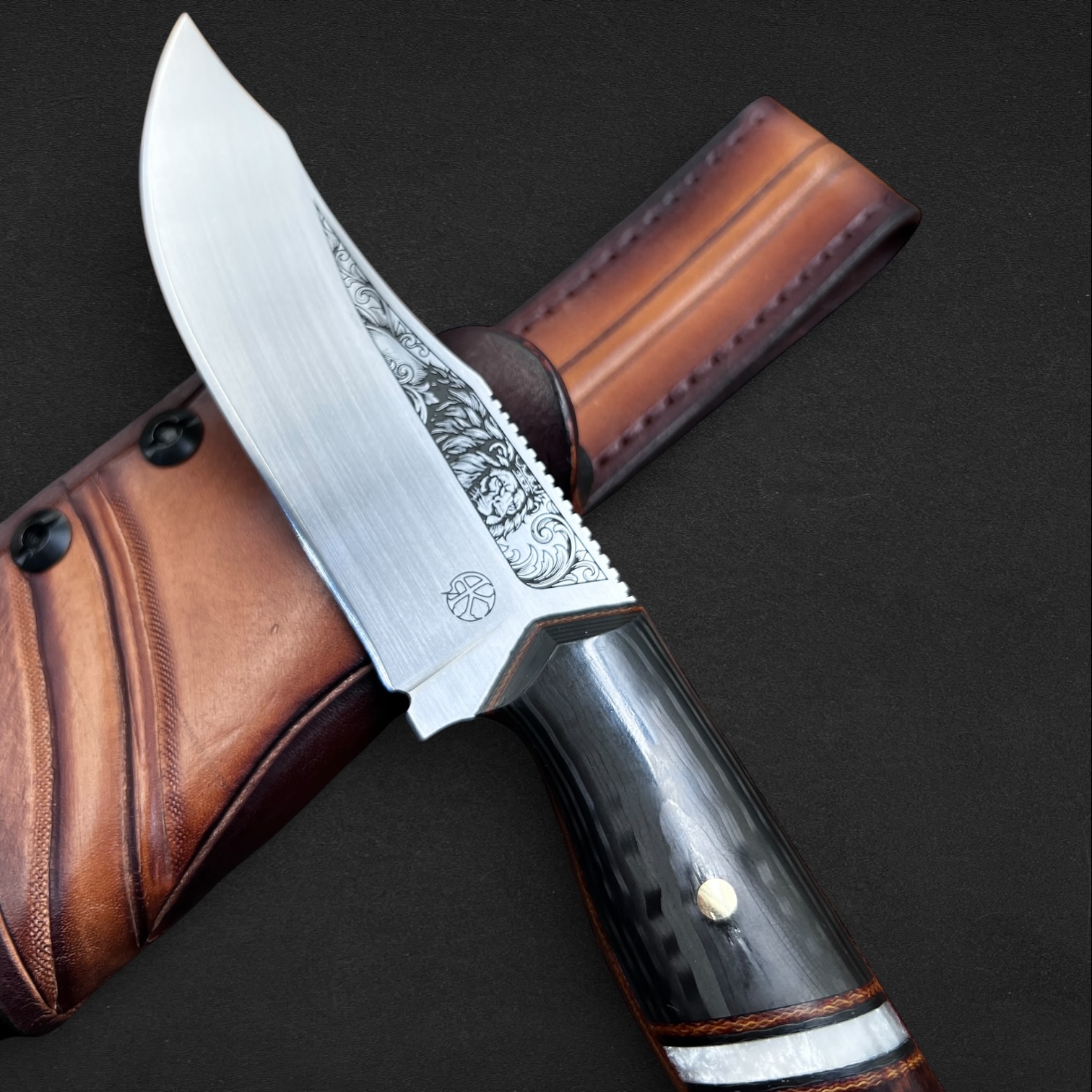 Ardeshir carries the legacy of Persian kings. The blade bears the crowned lion engraving, a historic emblem of strength and sovereignty. The handle blends deep snakewood with pearlescent Nebula carbon fiber and layered carbon fiber, framed by canvas micarta spacers and liners to create a bold and powerful composition. Forged from 80CrV2 carbon steel and paired with a hand-stamped hybrid leather and kydex sheath, this knife reflects authority, strength, and enduring craftsmanship.