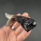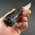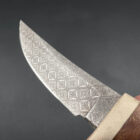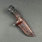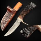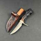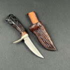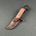 Sheath: Elkstalker comes with a custom, hand-stitched leather sheath. This sheath features carvings that mirror the knife’s handle, resembling the intricate network of bone marrow. The leather has been stained to a rich, warm color, enhancing the natural beauty of the material and adding an additional layer of sophistication to the knife’s presentation.