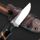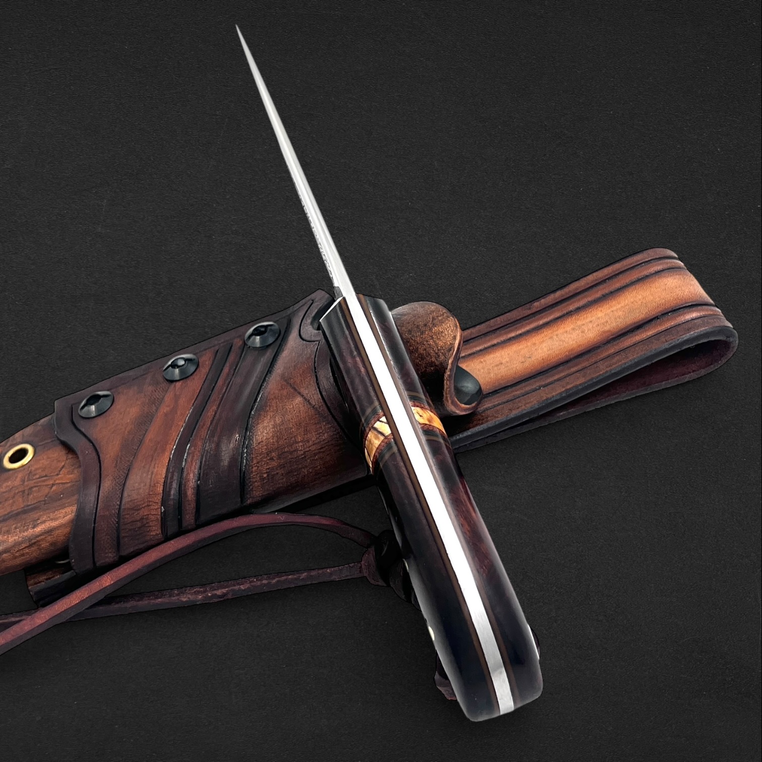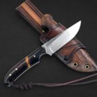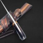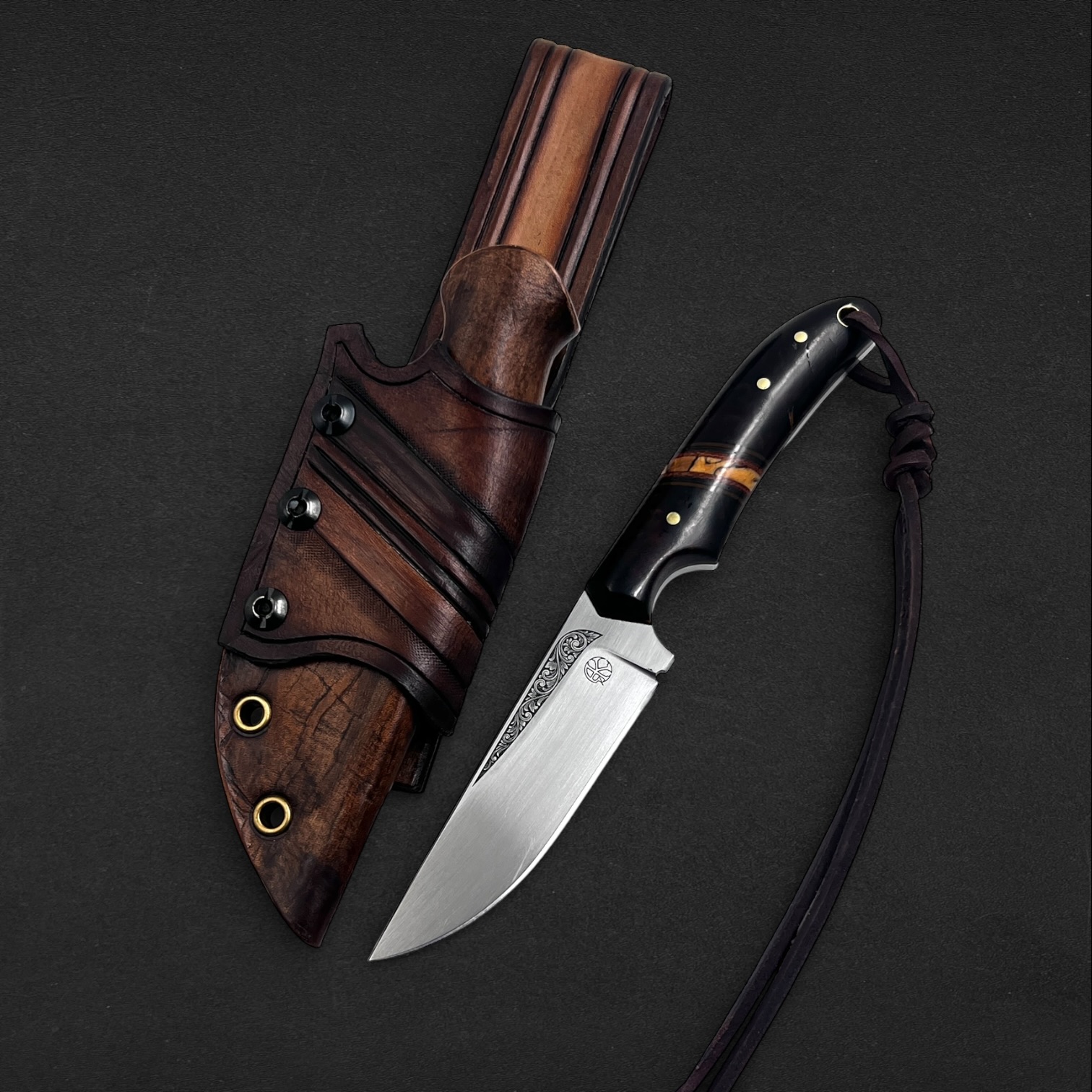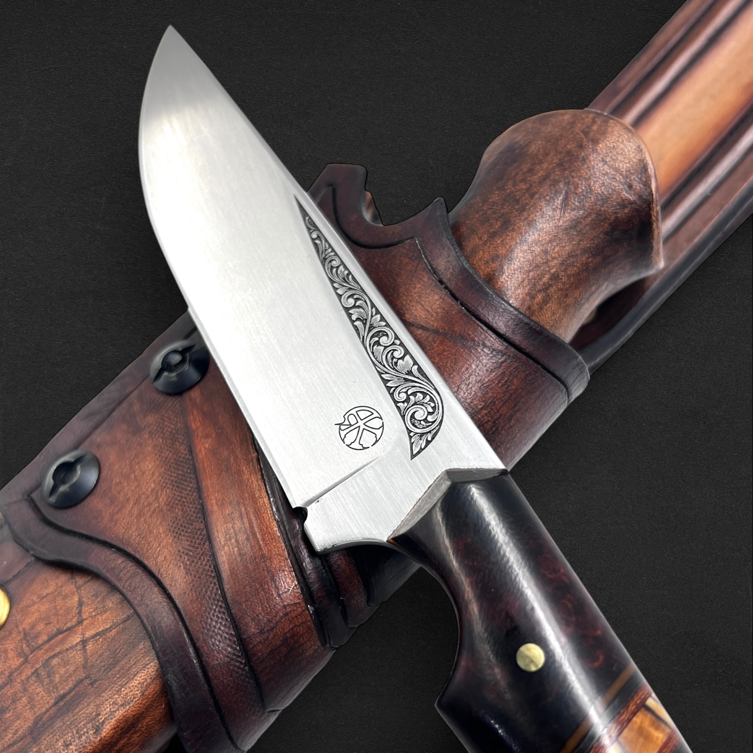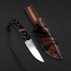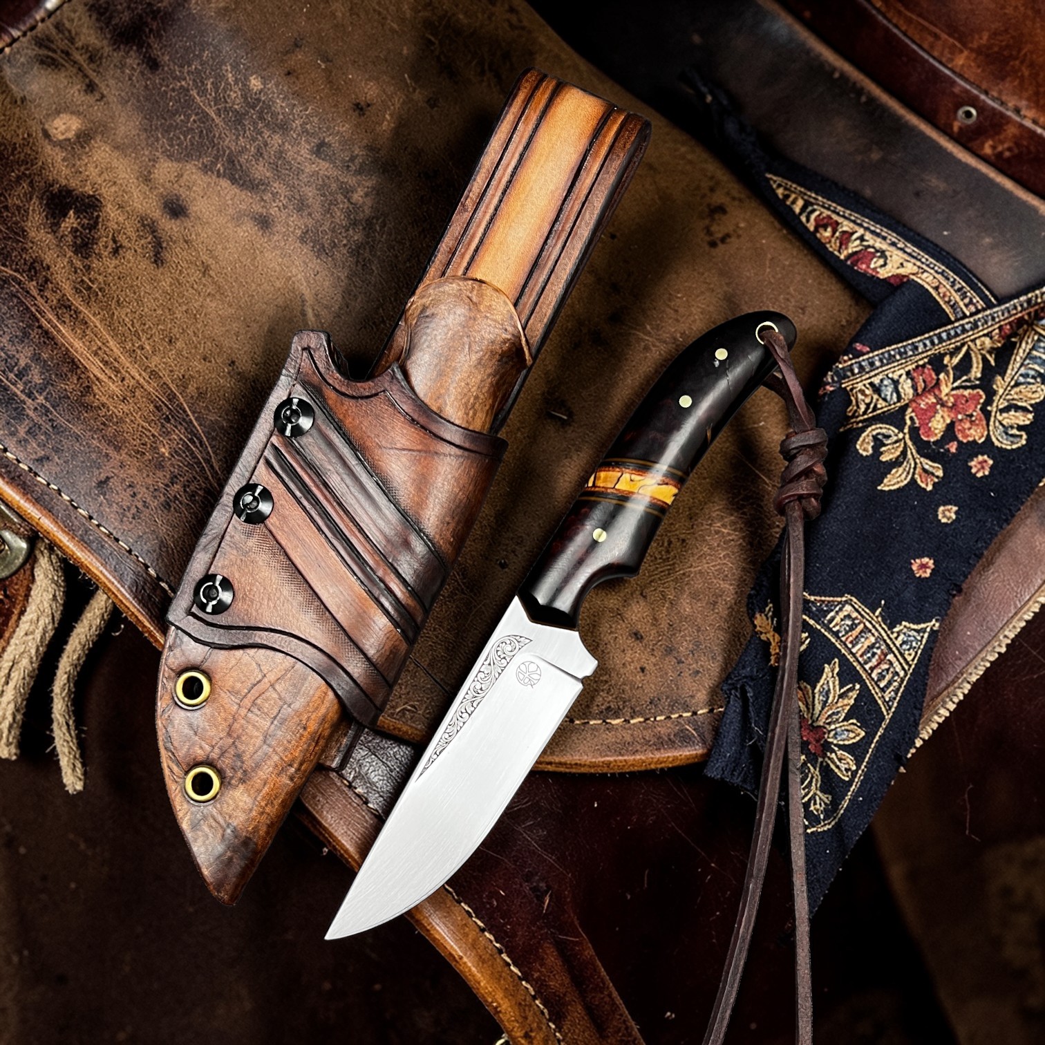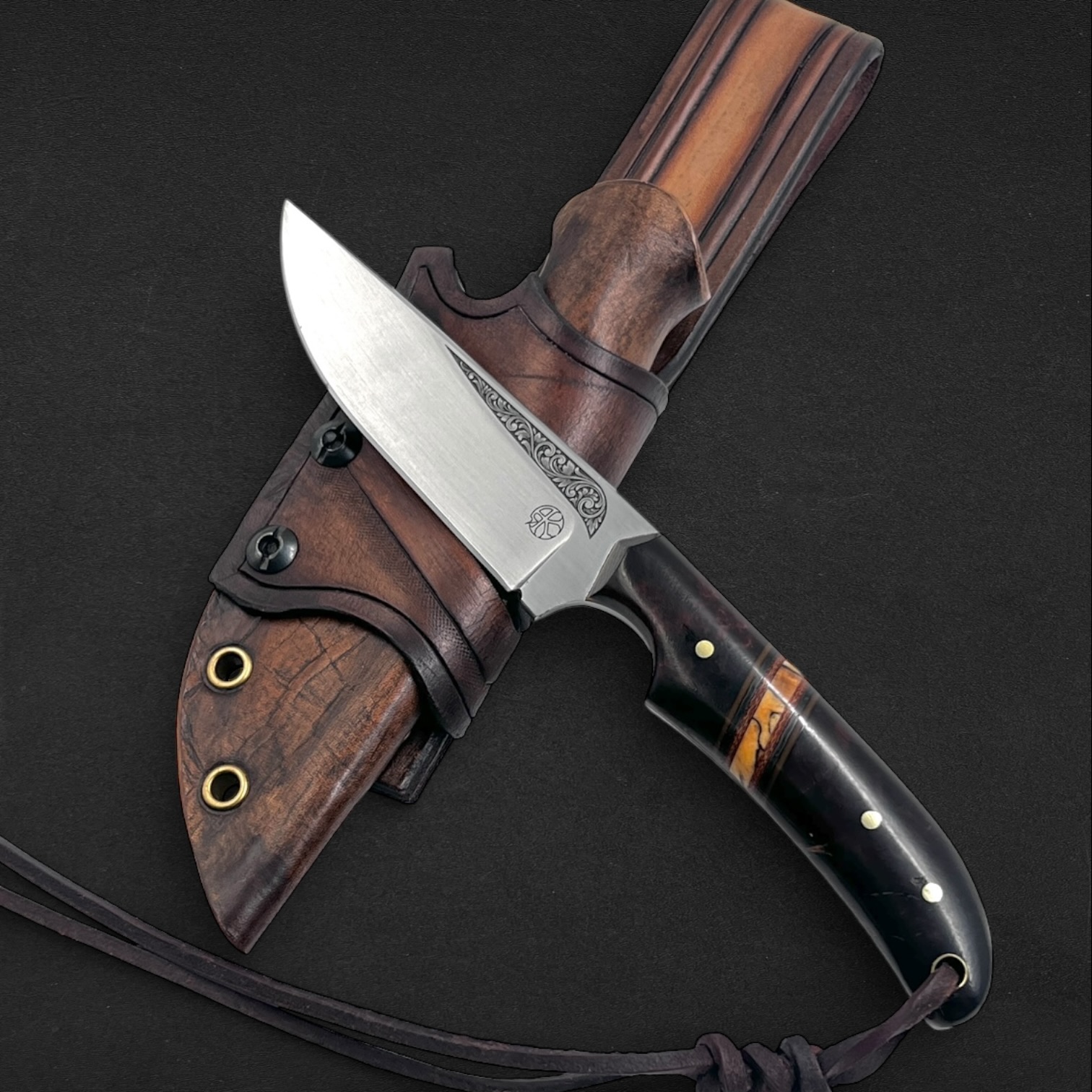 Farhang reflects elegance and cultural heritage. The handle combines richly patterned ironwood with spalted maple, balanced with canvas micarta, carbon fiber, and vintage paper micarta spacers and liners to create a refined and timeless composition. Persian-inspired engraving flows along the 80CrV2 carbon steel blade, giving the piece a quiet sense of tradition and artistry. Paired with a handcrafted hybrid leather and kydex sheath, this knife embodies classic craftsmanship and enduring character.