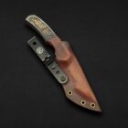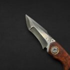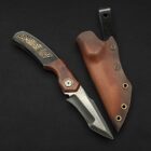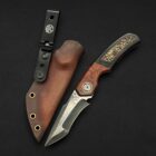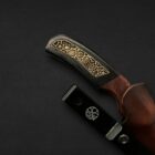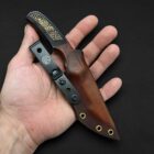 A former folder reborn as a bold full-tang showpiece. The 80CRV2 carbon-steel blade flaunts a dramatic compound grind and a reptilian-scale engraving that gives it unmistakable bite. The handle pairs desert ironwood and barrel wood with dual 3D-engraved brass inlays for a luxurious yet dangerous look. Finished with a hybrid Kydex/leather sheath and pocket clip for carry that matches its bite.