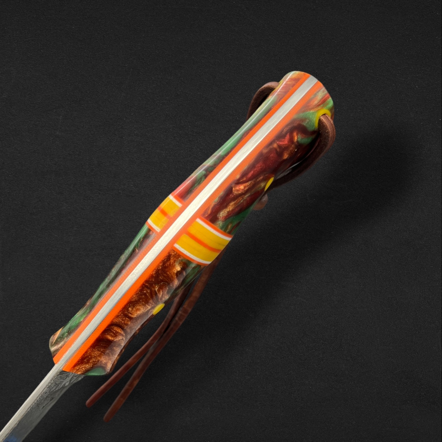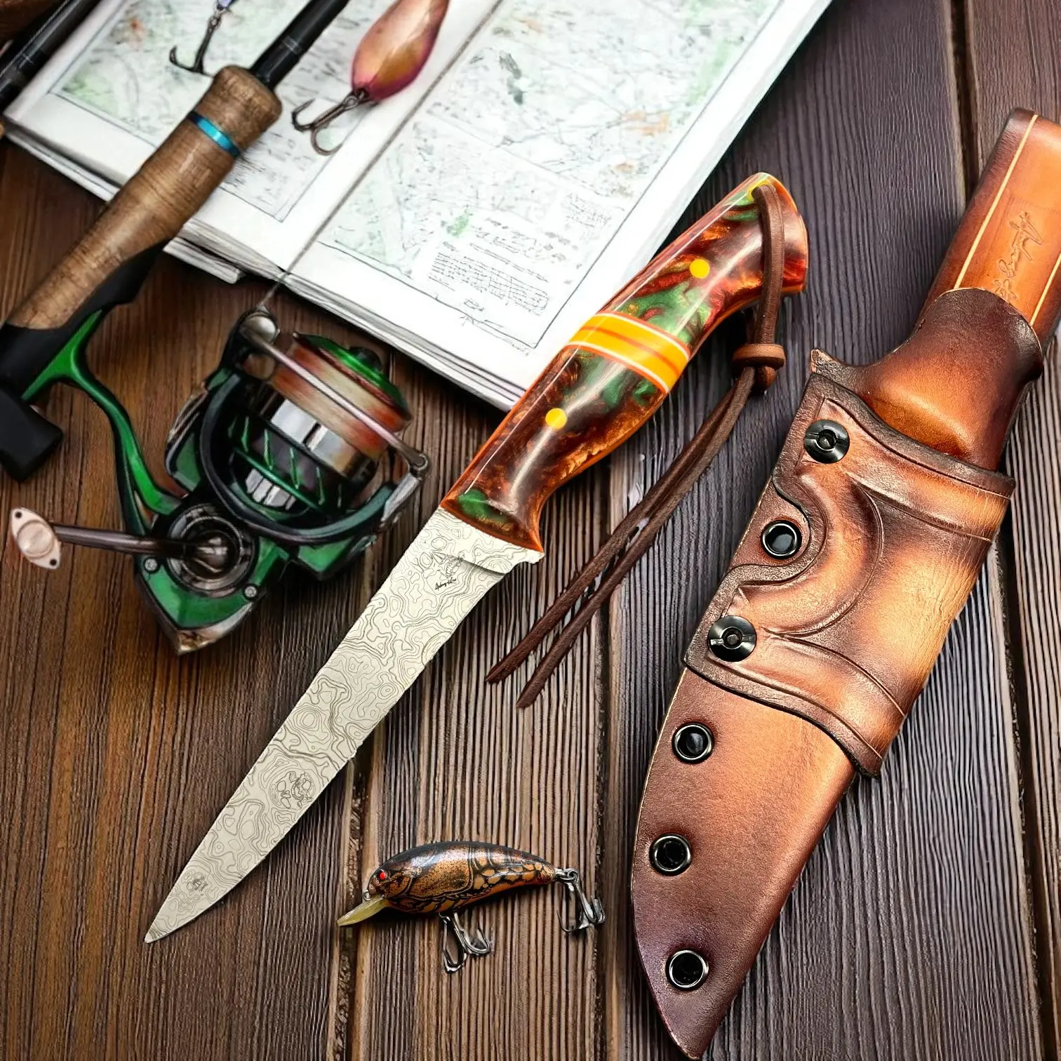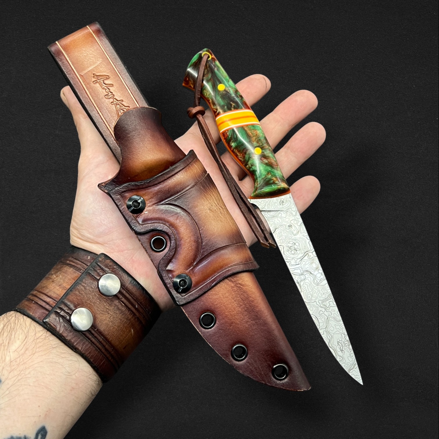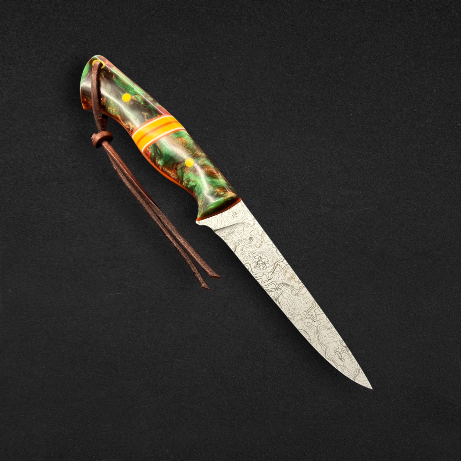 Precision, balance, and elegance define Lysander, a super-flexible fillet knife crafted from AEBL stainless steel — chosen for its smooth edge retention and adaptability in the hand. Its blade carries a custom typographical engraving pattern, echoing the flowing rhythm of water and the artistry of craftsmanship. The Nebula handle, infused with swirling amber-greens and cosmic blues, is set with G10 liners and spacers, creating a perfect fusion of strength and style. Completed with a hybrid Kydex and leather sheath, Lysander moves like liquid light — a blade made for those who follow the rivers and trust their own precision.