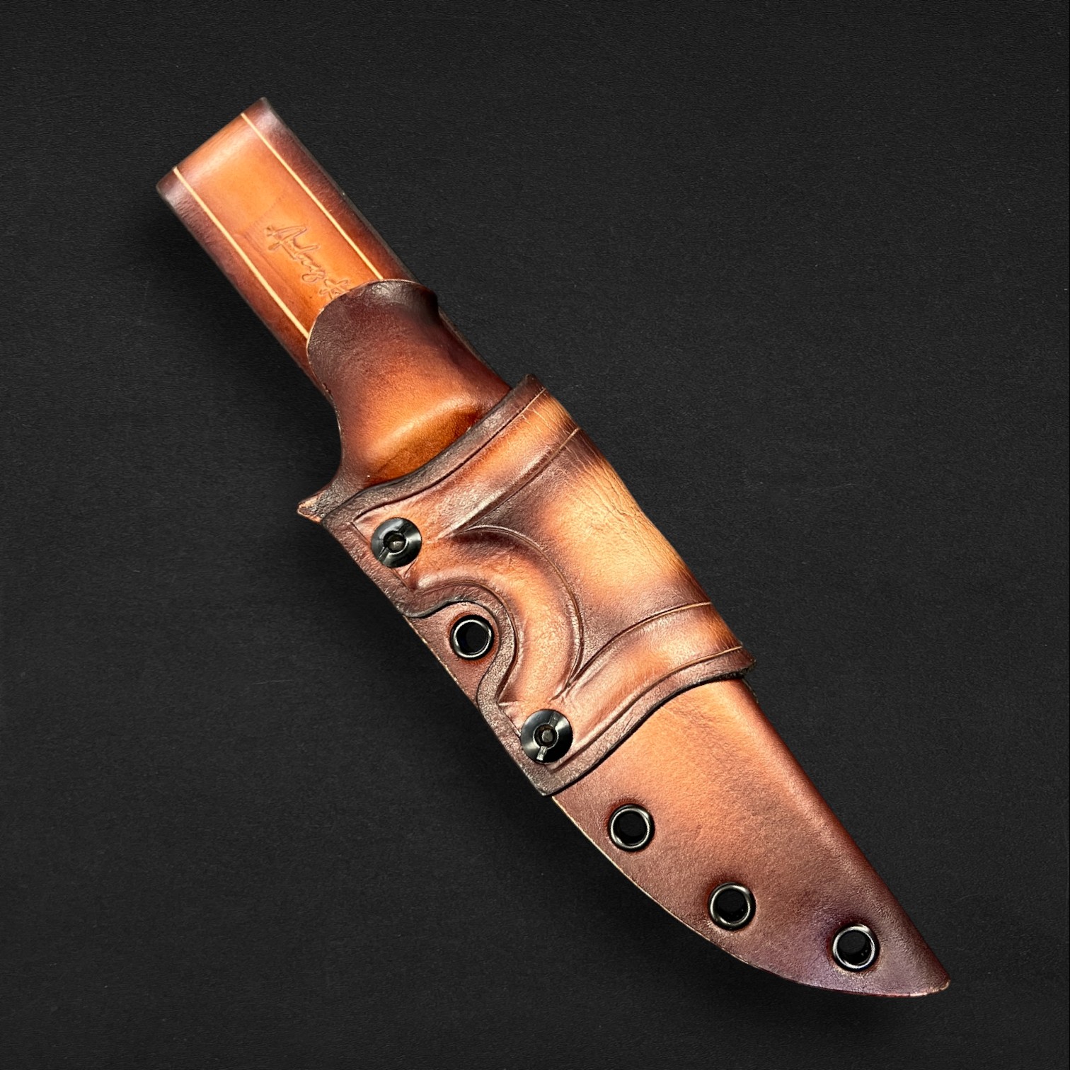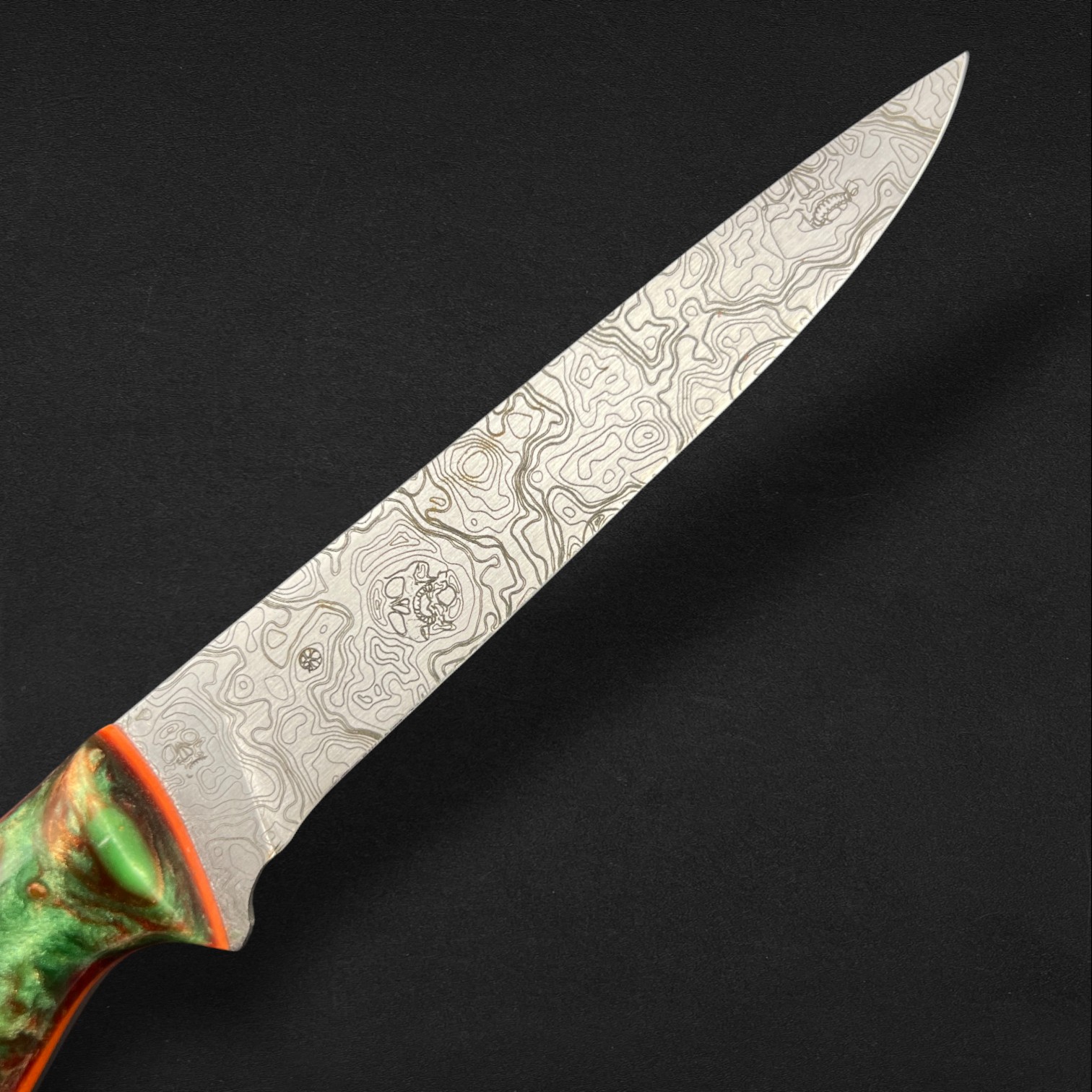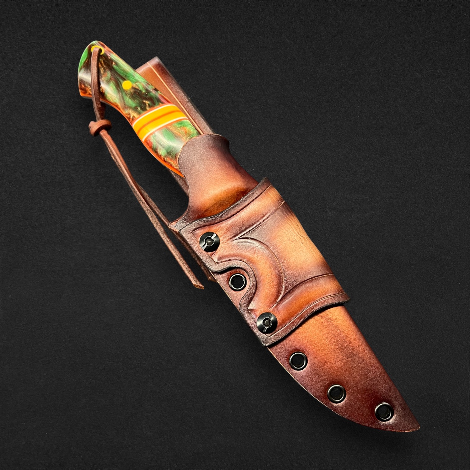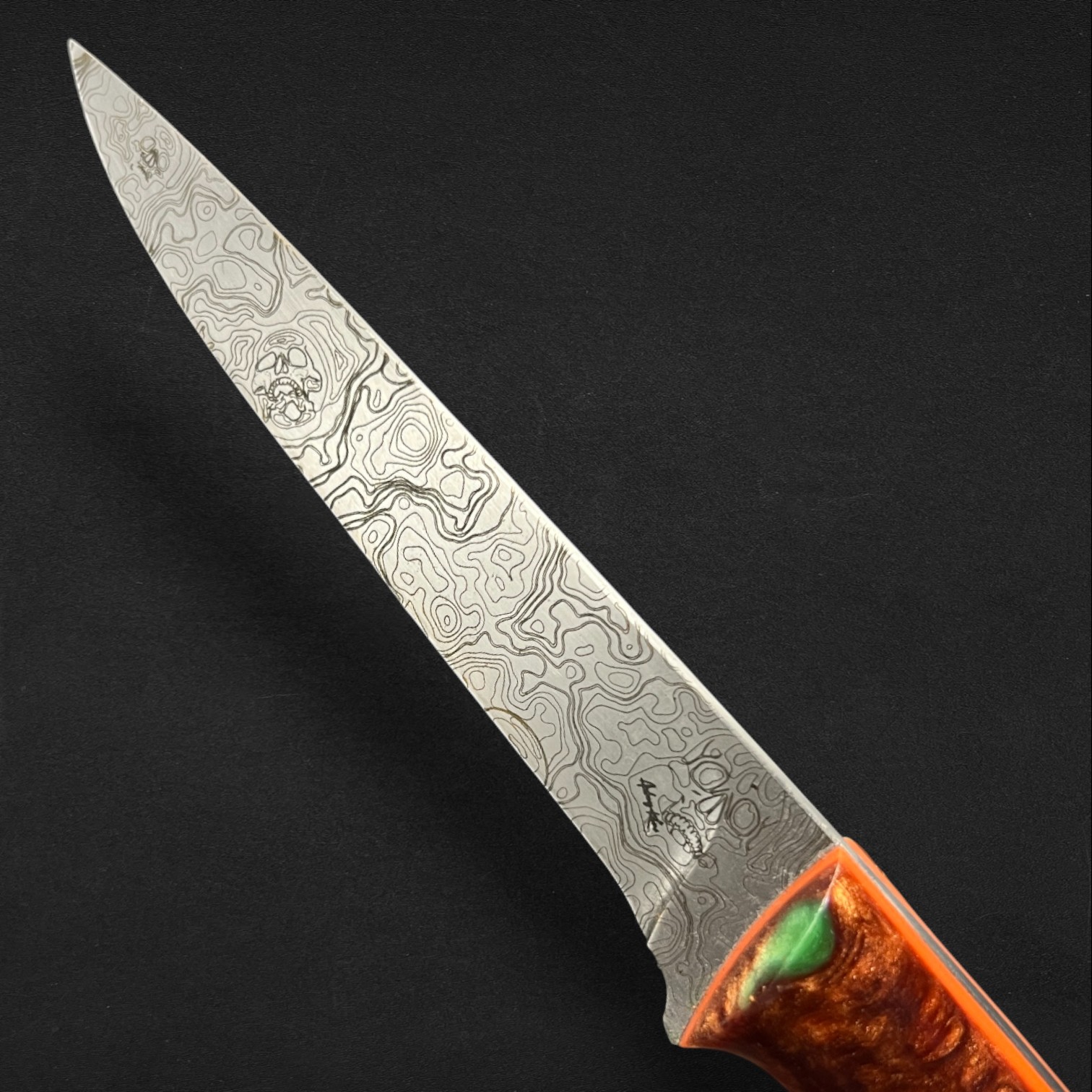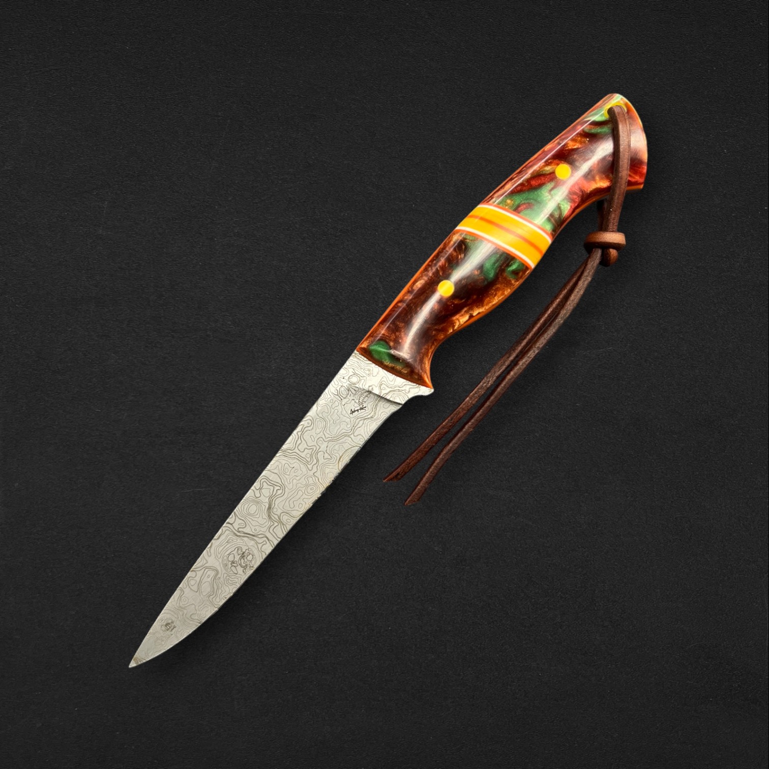 Precision, balance, and elegance define Lysander, a super-flexible fillet knife crafted from AEBL stainless steel — chosen for its smooth edge retention and adaptability in the hand. Its blade carries a custom typographical engraving pattern, echoing the flowing rhythm of water and the artistry of craftsmanship. The Nebula handle, infused with swirling amber-greens and cosmic blues, is set with G10 liners and spacers, creating a perfect fusion of strength and style. Completed with a hybrid Kydex and leather sheath, Lysander moves like liquid light — a blade made for those who follow the rivers and trust their own precision.