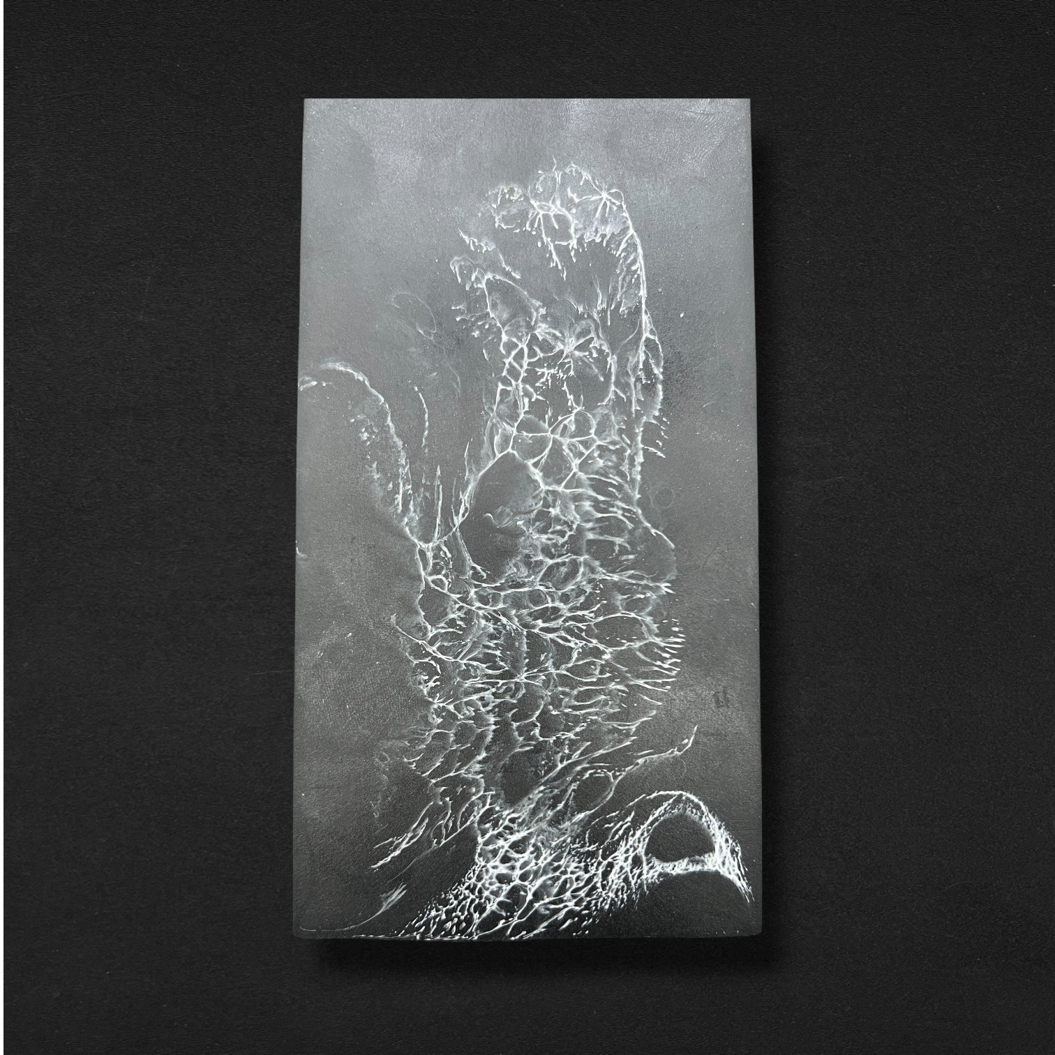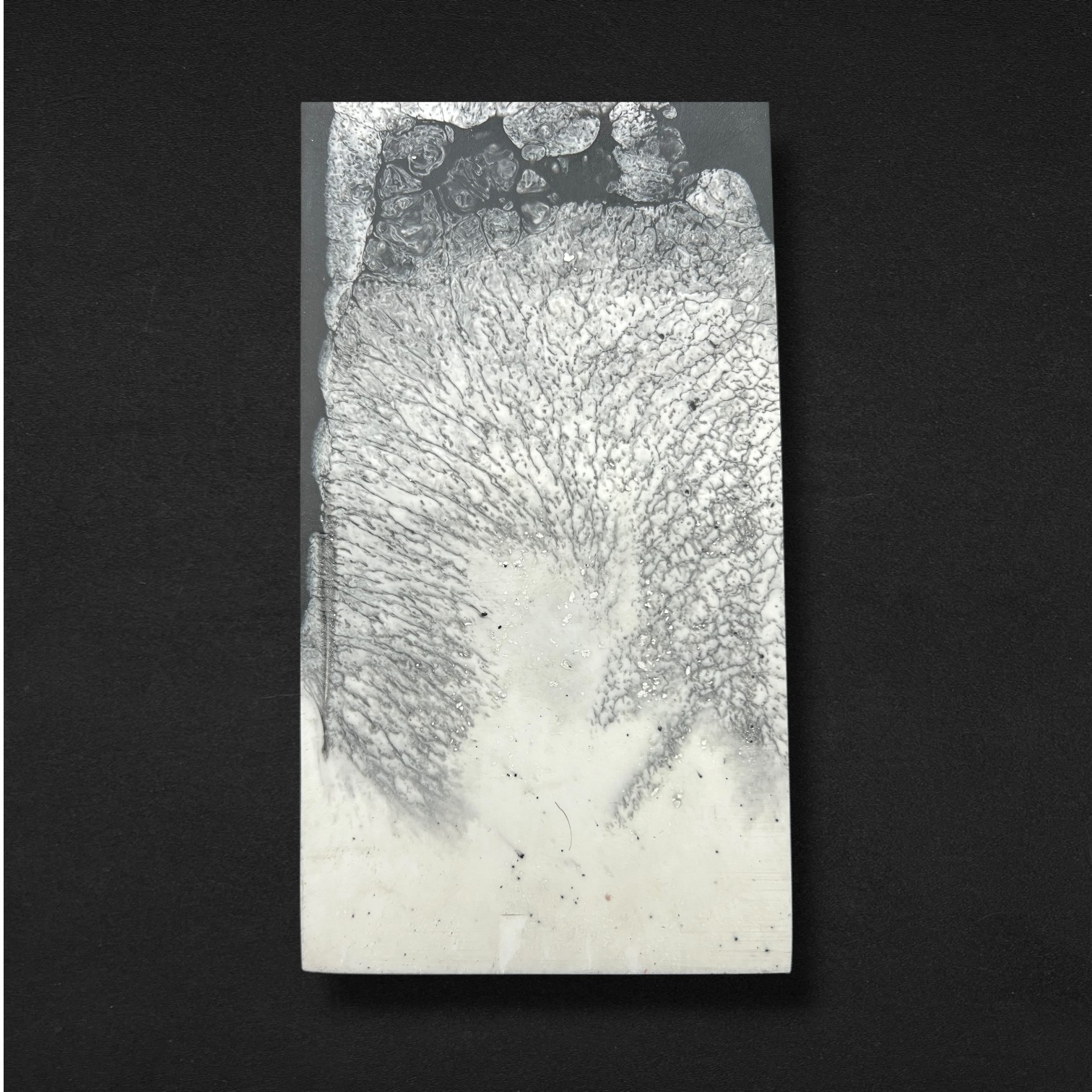 Ethereal black and ghostly white textures define Phantom Trace, a spectral reminder of stars fading into darkness. Made with Nebula urethane resin, pressure-cast for dense, bubble-free perfection.