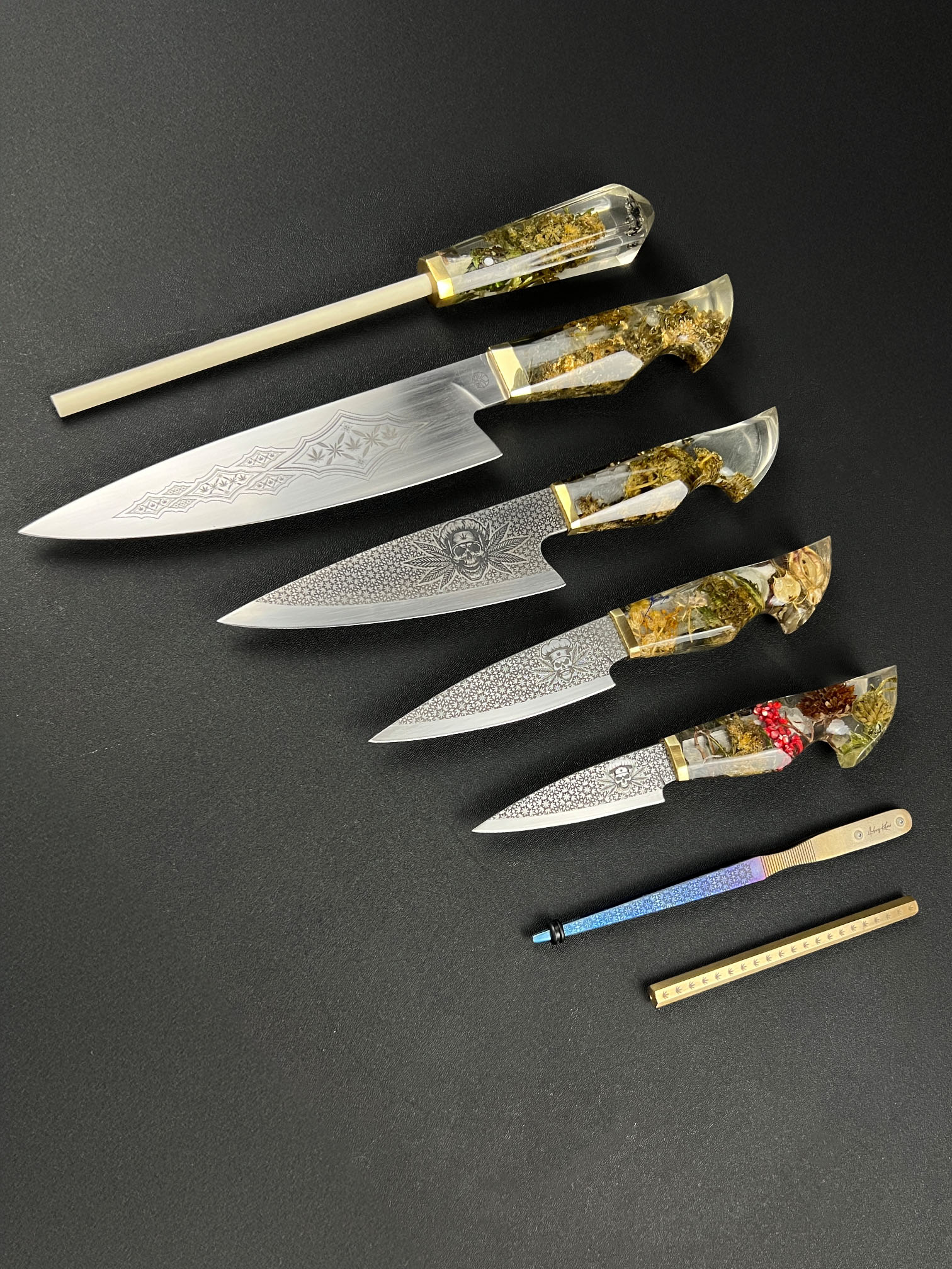 The Cannabinoid Set is a complete, ground-up collector work — conceived, built, and finished as a unified system rather than a collection of individual tools. It begins with raw plant material and ends as a fully realized object of craftsmanship, where steel, resin, and leather are treated with equal intent.