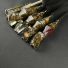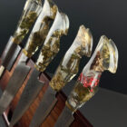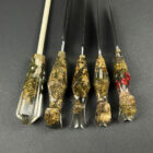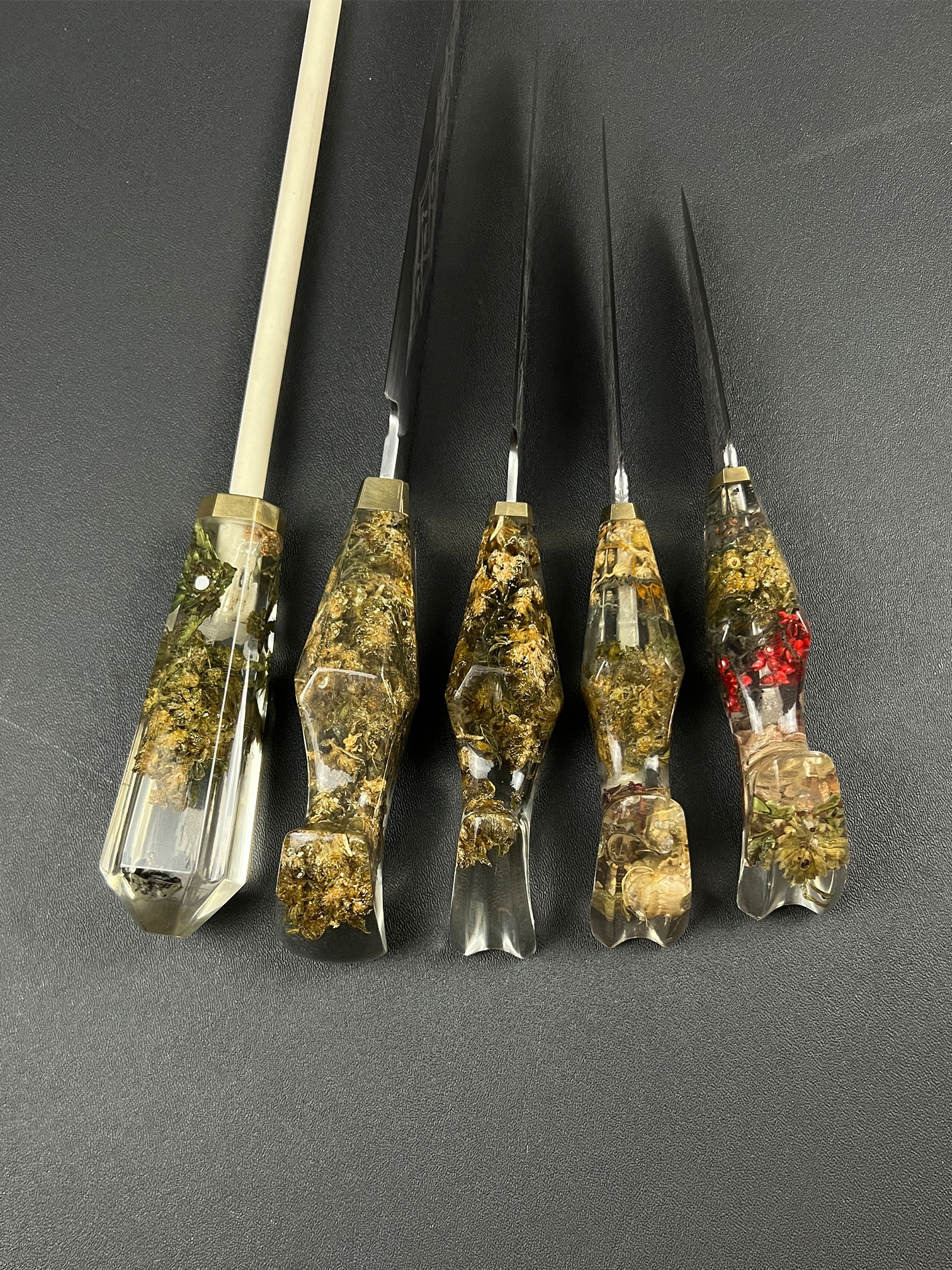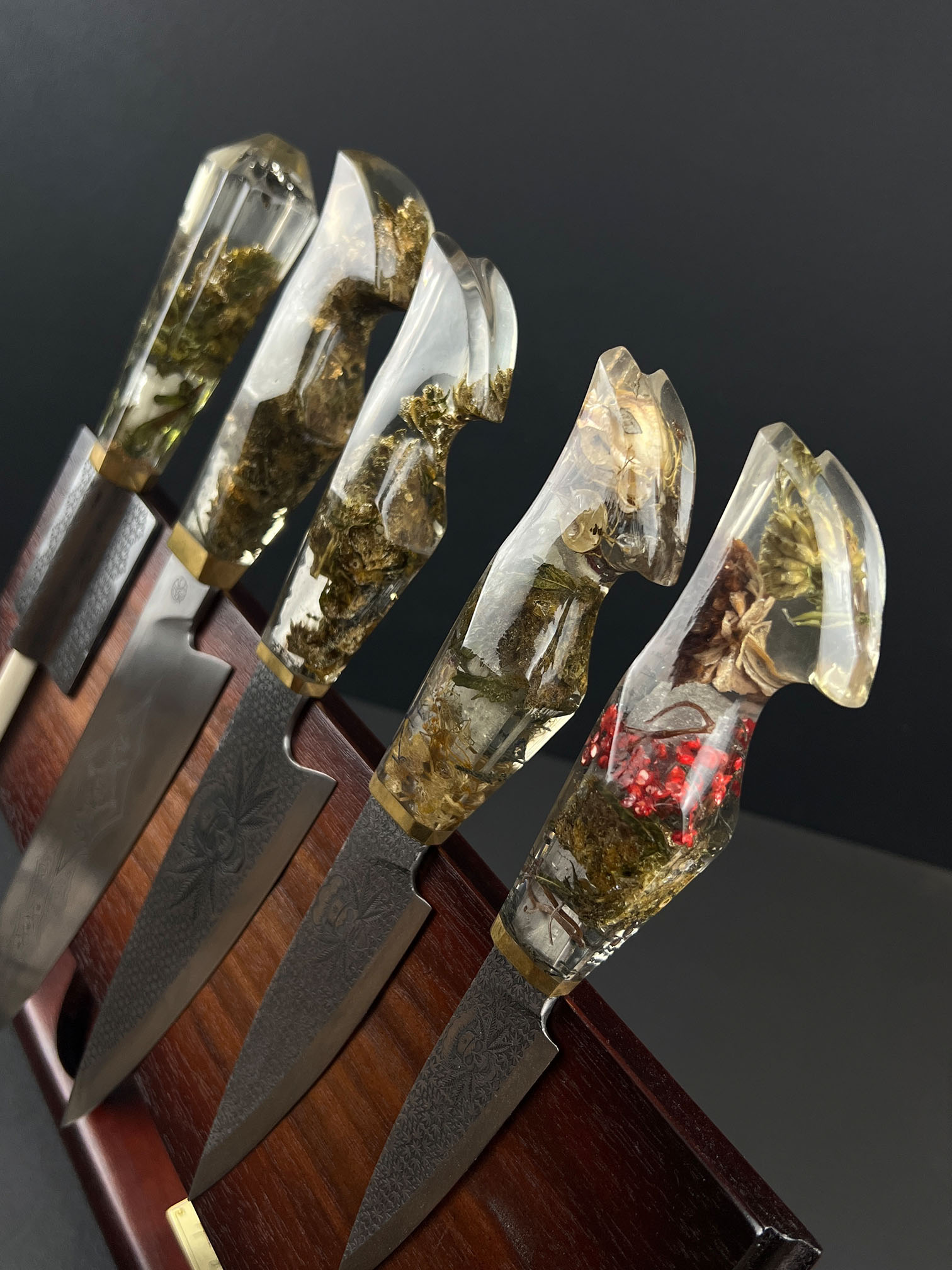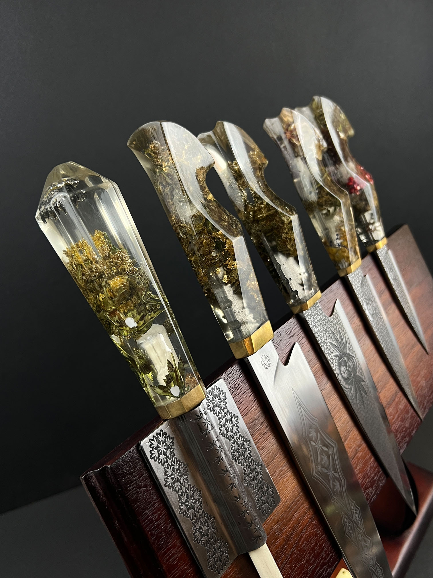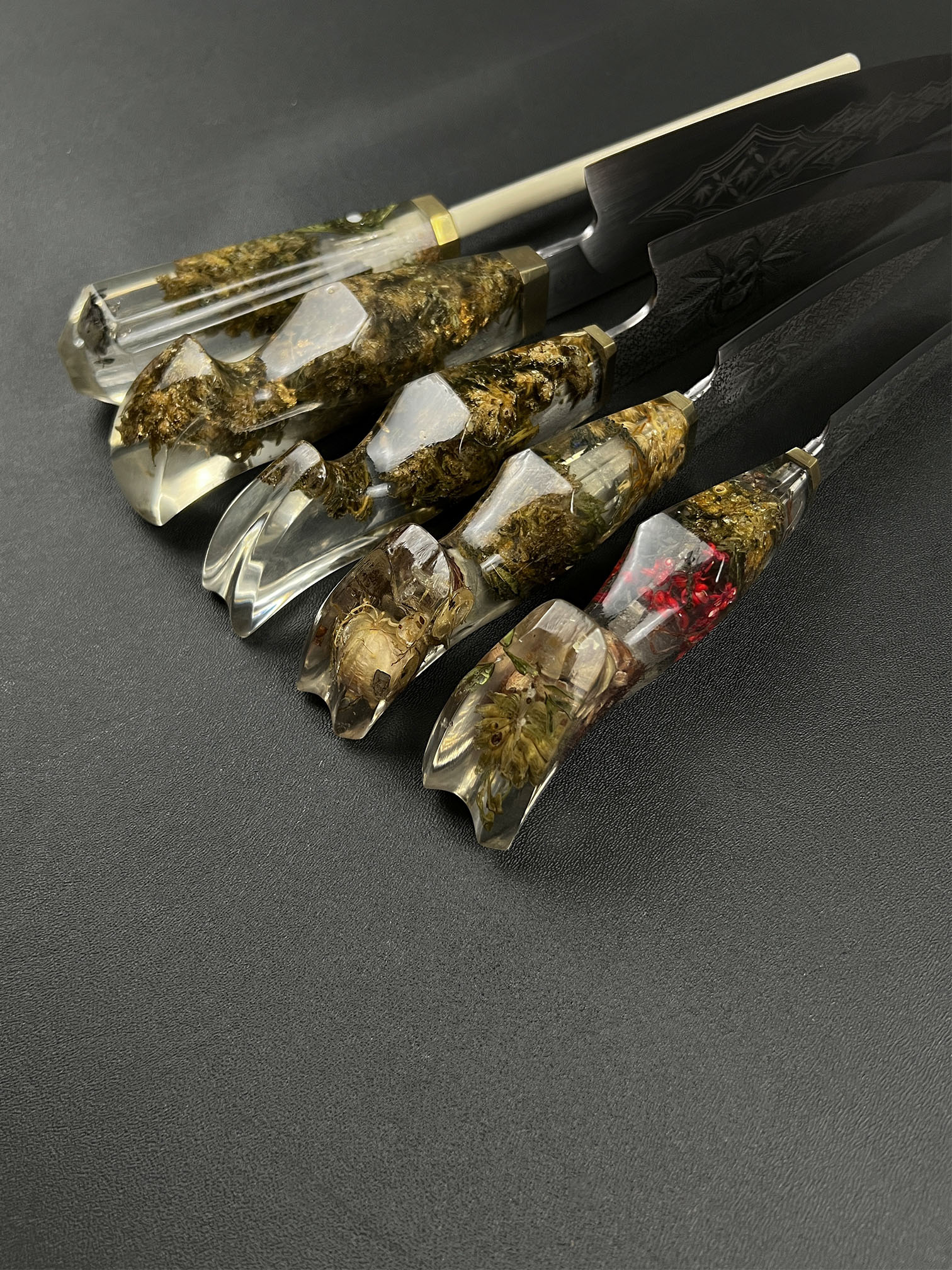• Handles cast from preserved cannabis material suspended in clear resin