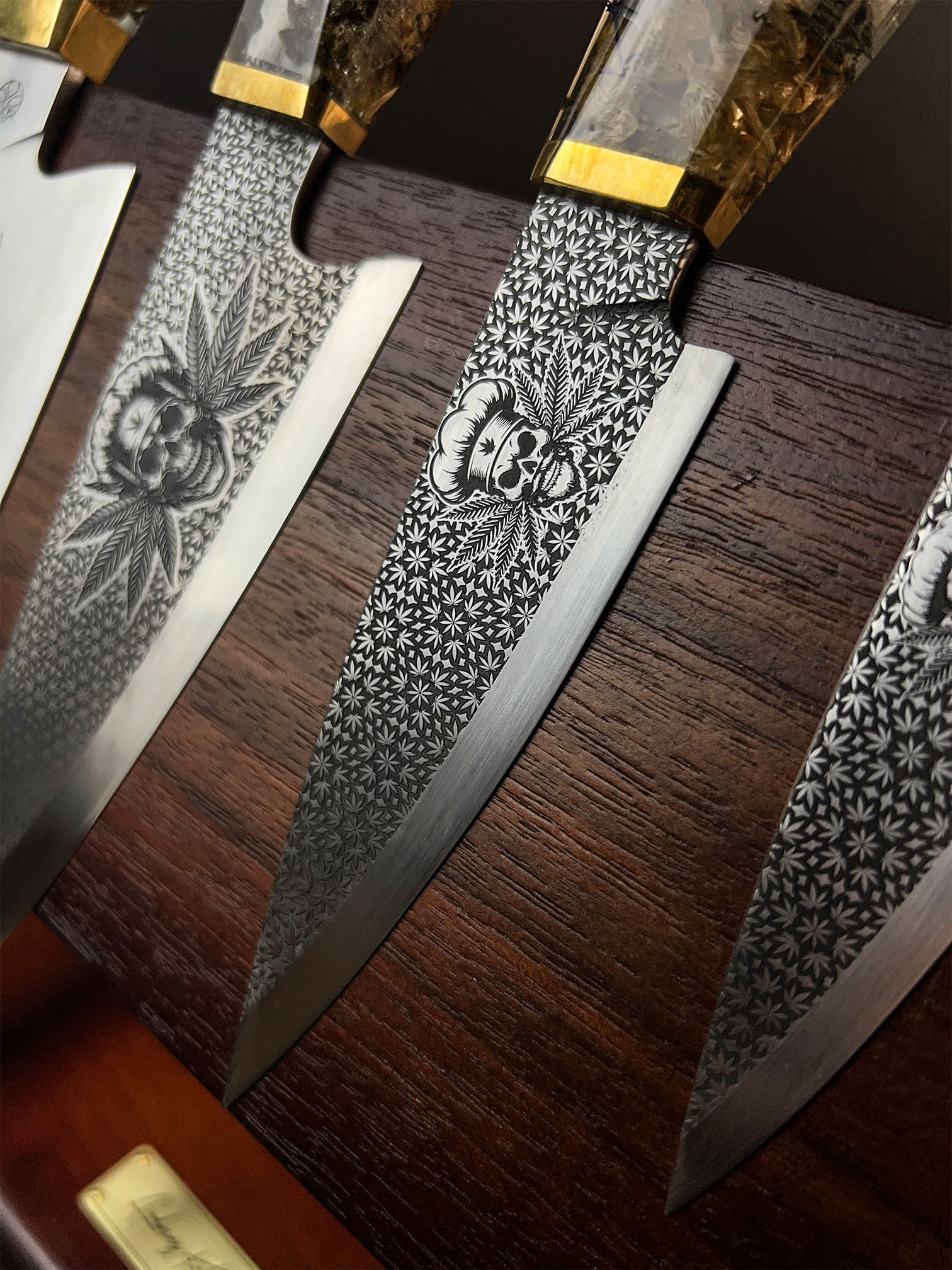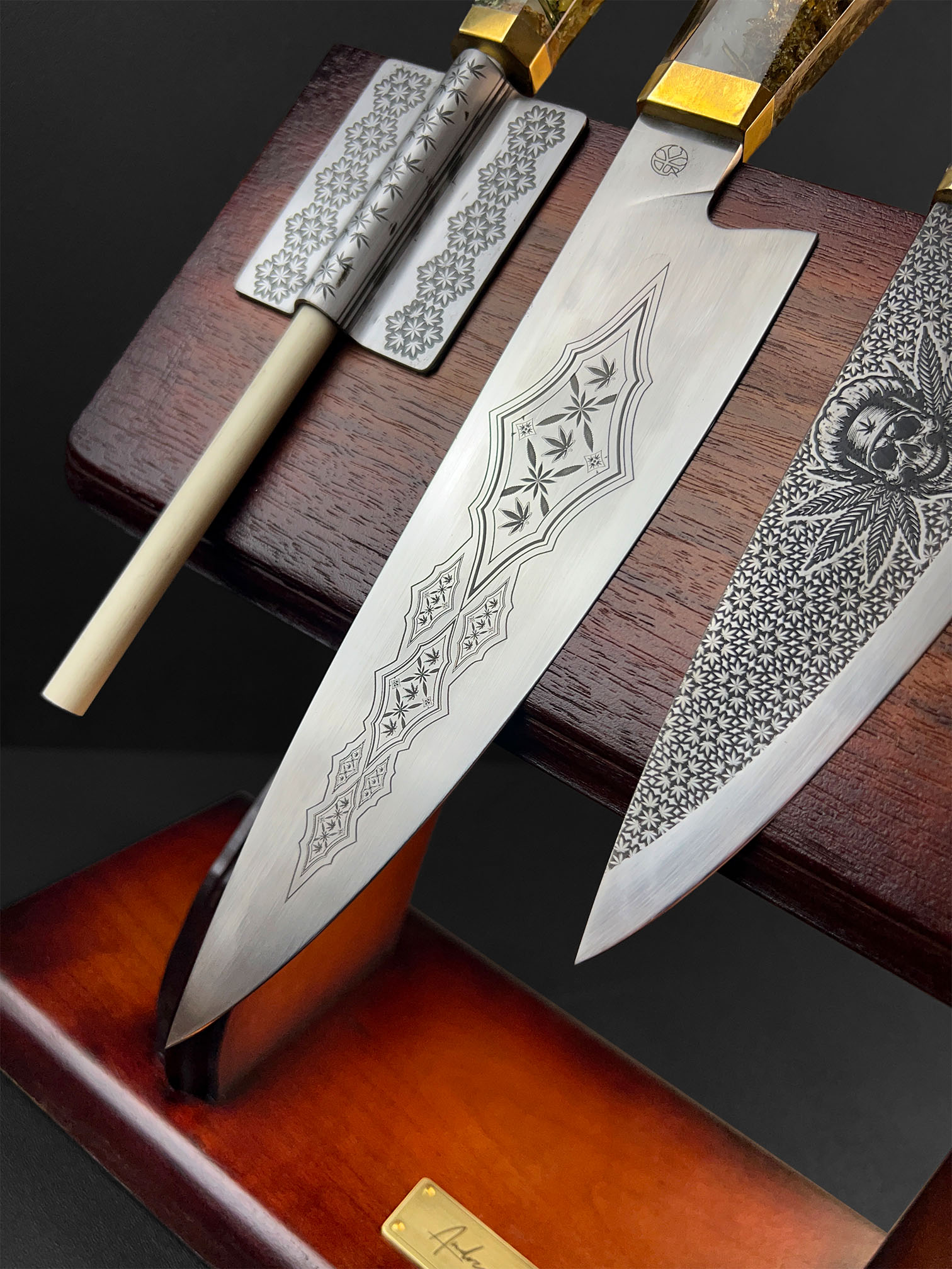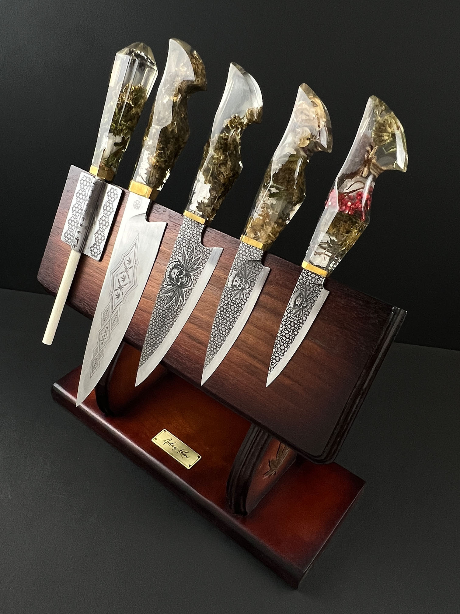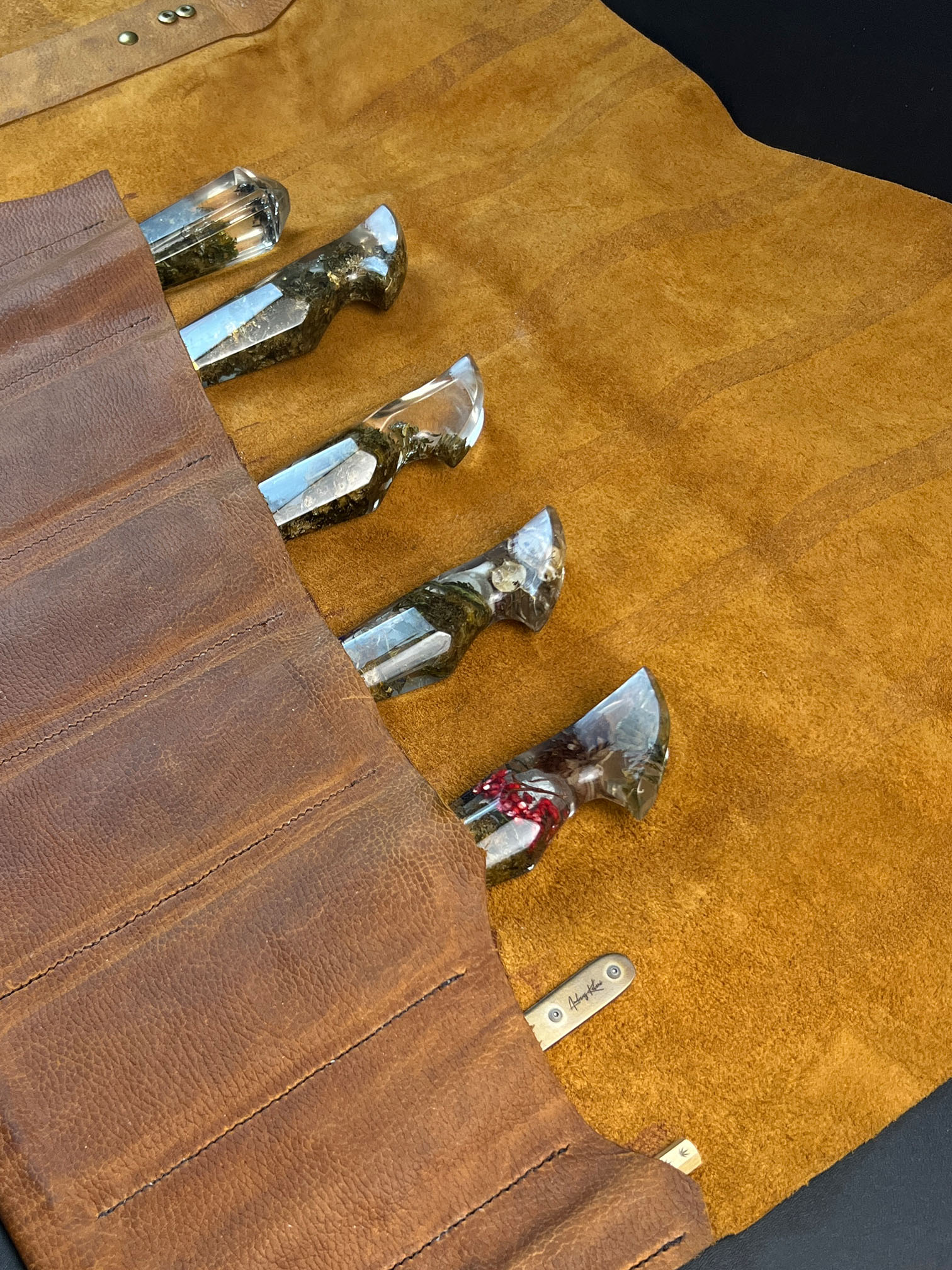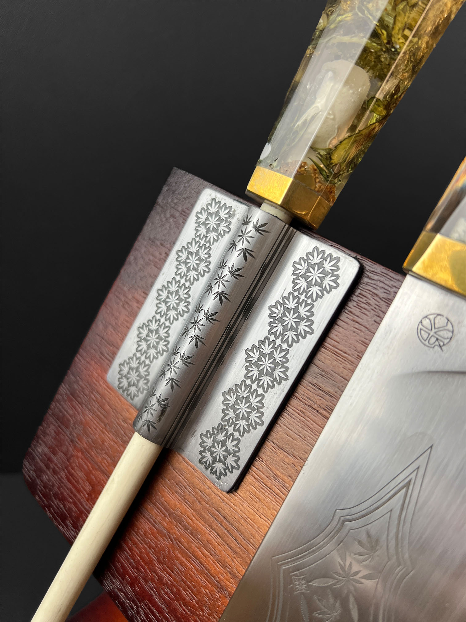 Conceived as a one-off Signature Collection work, The Cannabinoid Set was created for a close collector rather than for public release or repetition. It represents a convergence of process-heavy disciplines — material preservation, blade work, engraving, and leather construction — unified into a single functional narrative.