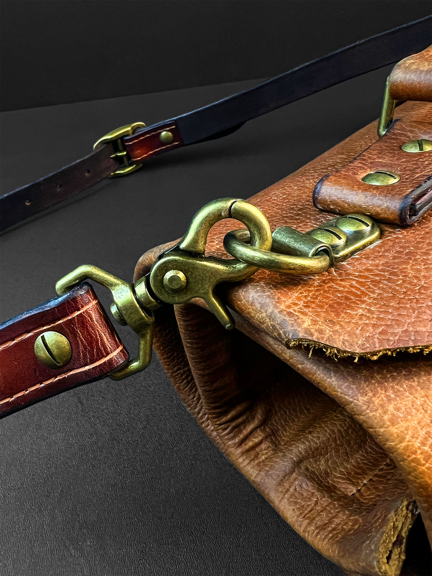 • Solid brass hardware, heavy-duty snap hook, and integrated carry strap