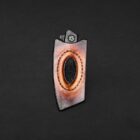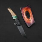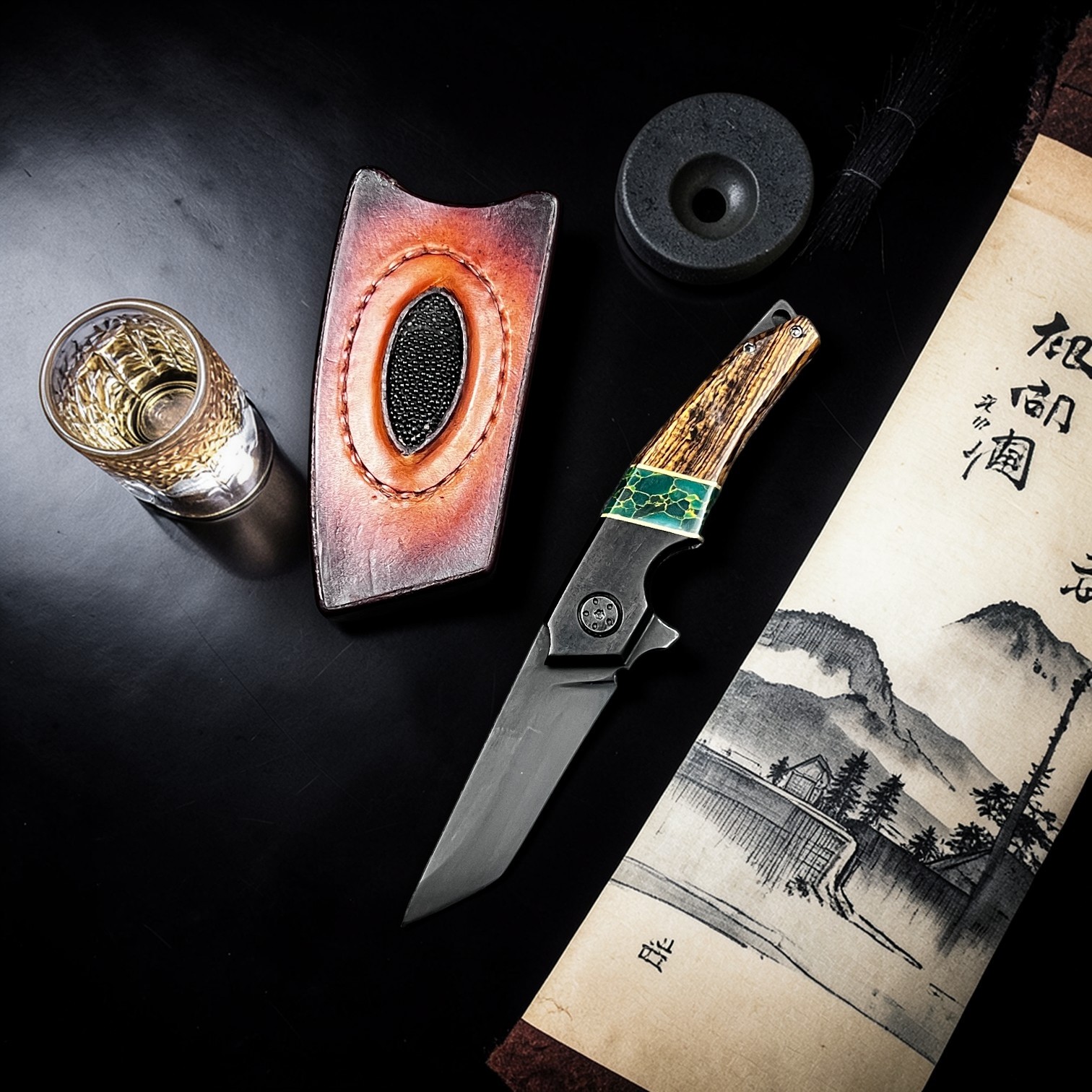 Zumurrud reflects the presence of deep green stone within the handle. The Japanese tanto-style blade is finished in black oxide and mounted on a black-oxide titanium frame with smooth action. The handle combines ancient bog oak and bocote wood with true stone jade featuring gold veins and brass liners, creating a strong contrast of dark wood and vibrant stone. Paired with a stingray-embossed leather belt pouch, this folder carries a refined balance of strength, craftsmanship, and natural elegance.